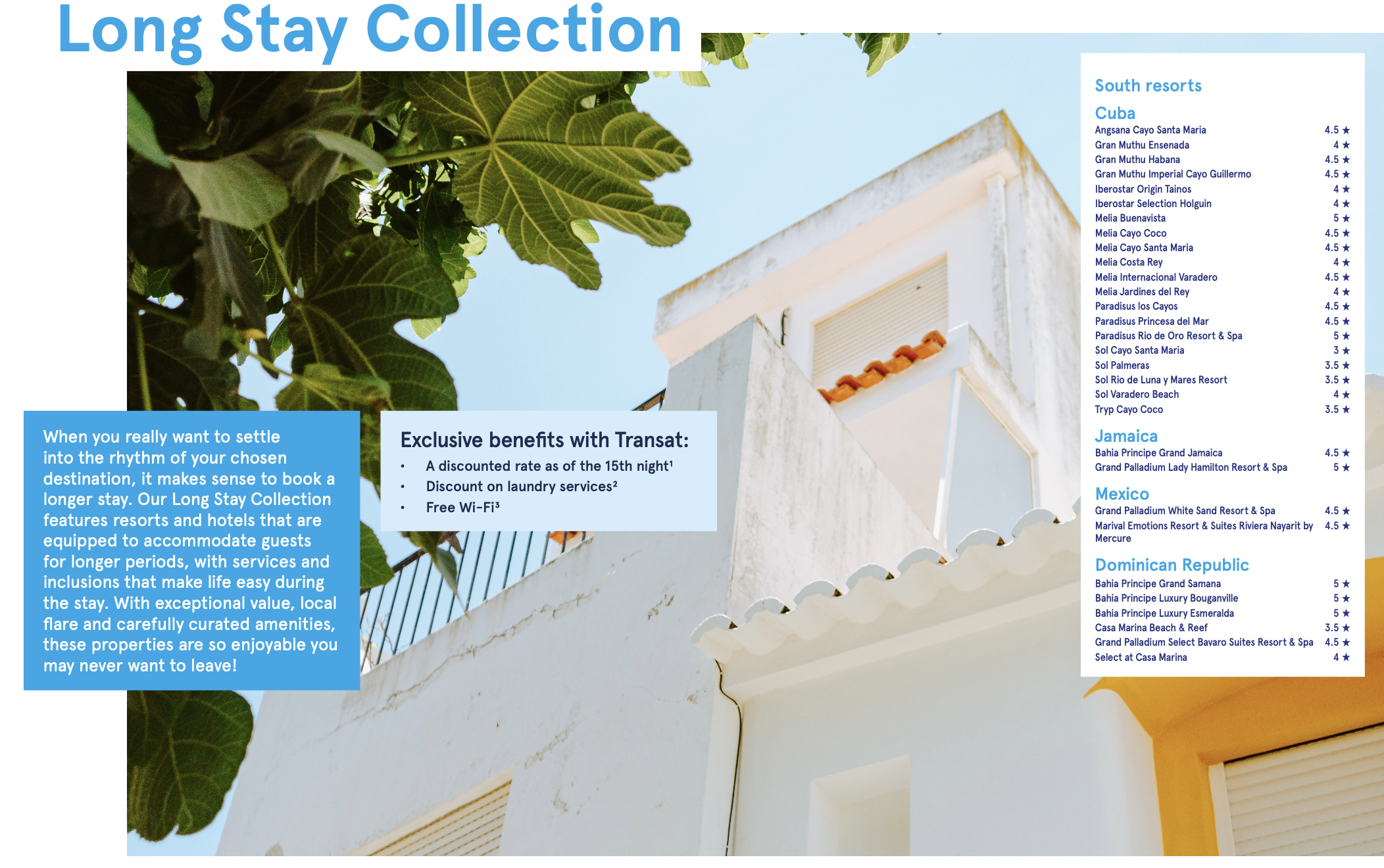 Transat’s Long Stay Collection offers extended-stay vacations across Cuba, Mexico, Jamaica, and the Dominican Republic, complete with exclusive benefits like discounted long-term rates and free Wi-Fi.